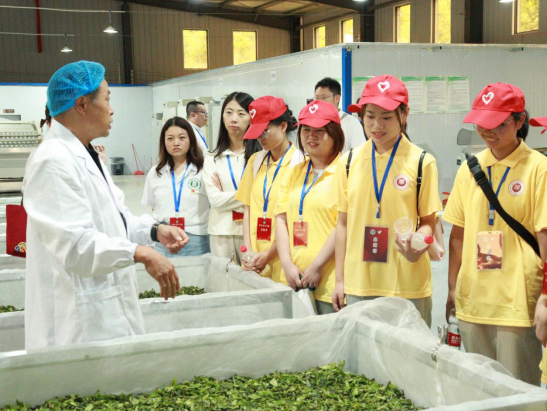 到达目的地贵安新区马场镇四村党群服务中心后,坐落于四村古茶树茶园基地的两山年轮茶业有限公司郭勇董事长一行接待了师生队伍并向大家介绍公司目前的运作情况和当地风土人情情况,师生队伍怀着好奇和激动的心情跟随茶厂有着三十年制茶经验的老师傅参观了茶厂制茶全过程。随着一阵茶香扑鼻而来,每一种茶需经多道工序方能制作而成。匠心难得,正是因为有了这些师傅的坚守,中国茶文化才能历久弥新,得以传承。