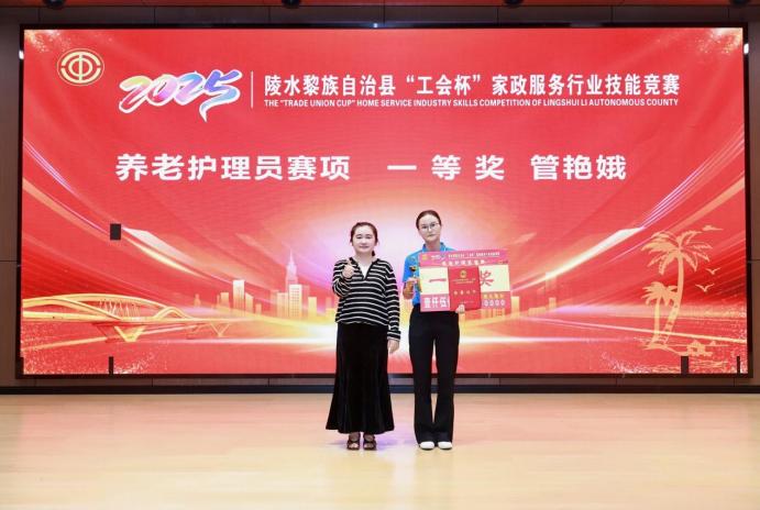 2025年11月25日至26日,海南陵水黎族自治县“工会杯”家政服务行业技能竞赛在陵水县职工活动中心一楼多媒体会议室举办。大赛汇聚来自全县各机构的60名养老护理员参赛。经过激烈角逐,我们2022级养老服务管理本科专业管艳娥同学凭借扎实的专业知识、精湛的养老实践技能和出色的应变能力,斩获大赛“养老护理员赛项”一等奖。